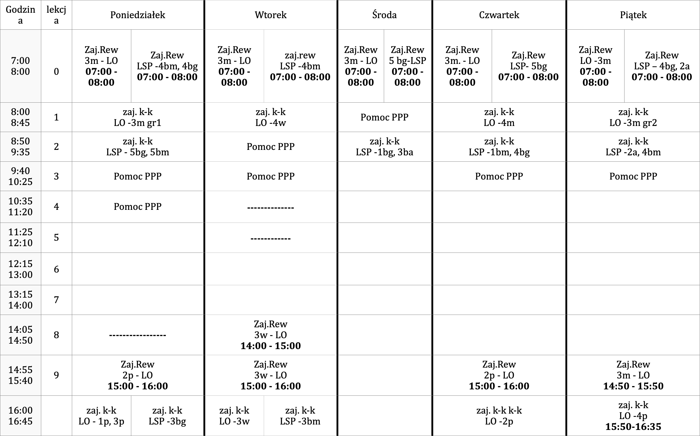 piątek – 08:30-19:40 i 10:25-15:25